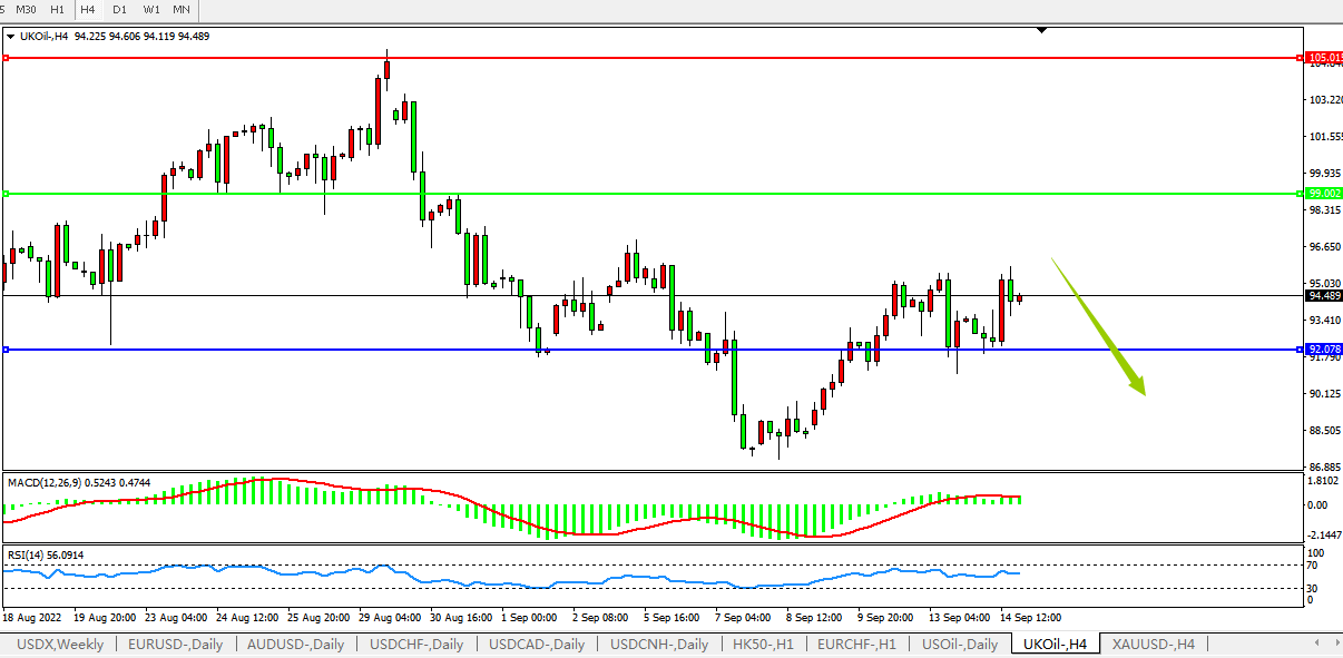 4小时图看:短线价格宽幅整理反复无常,中期图形结构中性, MACD量能柱0轴上小幅缩量,RSI整理偏弱,短期油价继续反弹后再度下行概率较大。