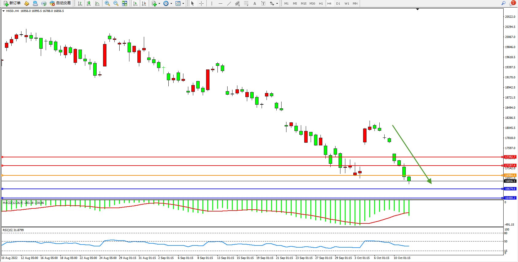 香港恒生指数10月11日(周二)收盘下跌384.3点,跌幅2.23%,报16832.36点;港股再度大跌,三大指数再创调整低价。恒指失守17000点整数关,恒生科技指数跌3.55%下破3300点,二者均录得4连跌。大型科技股依旧引领大市走低,腾讯跌破260港元;今日南下资金逆势净流入39.97亿港元,大市成交额为912亿港元。