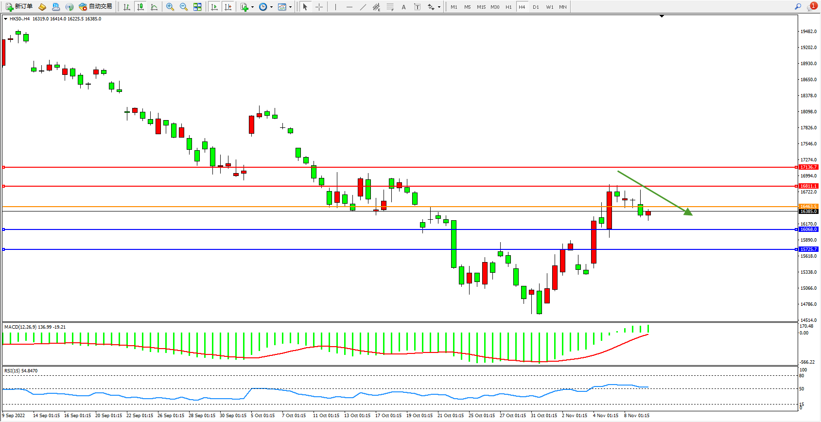 香港恒生指数11月9日(周三)收盘下跌198.79点,跌幅1.2%,报16358.52点;港股午后跌幅扩大,恒生科技指数一度跌至3%,收跌1.89%失守3300点,恒指、国指分别跌1.2%和1.21%。大型科技股全线低迷拖累大市下行,百度跌4%,腾讯、京东、美团跌超3%,南下资金全日逆势净流入11.89亿港元,大市成交额为1112亿港元。