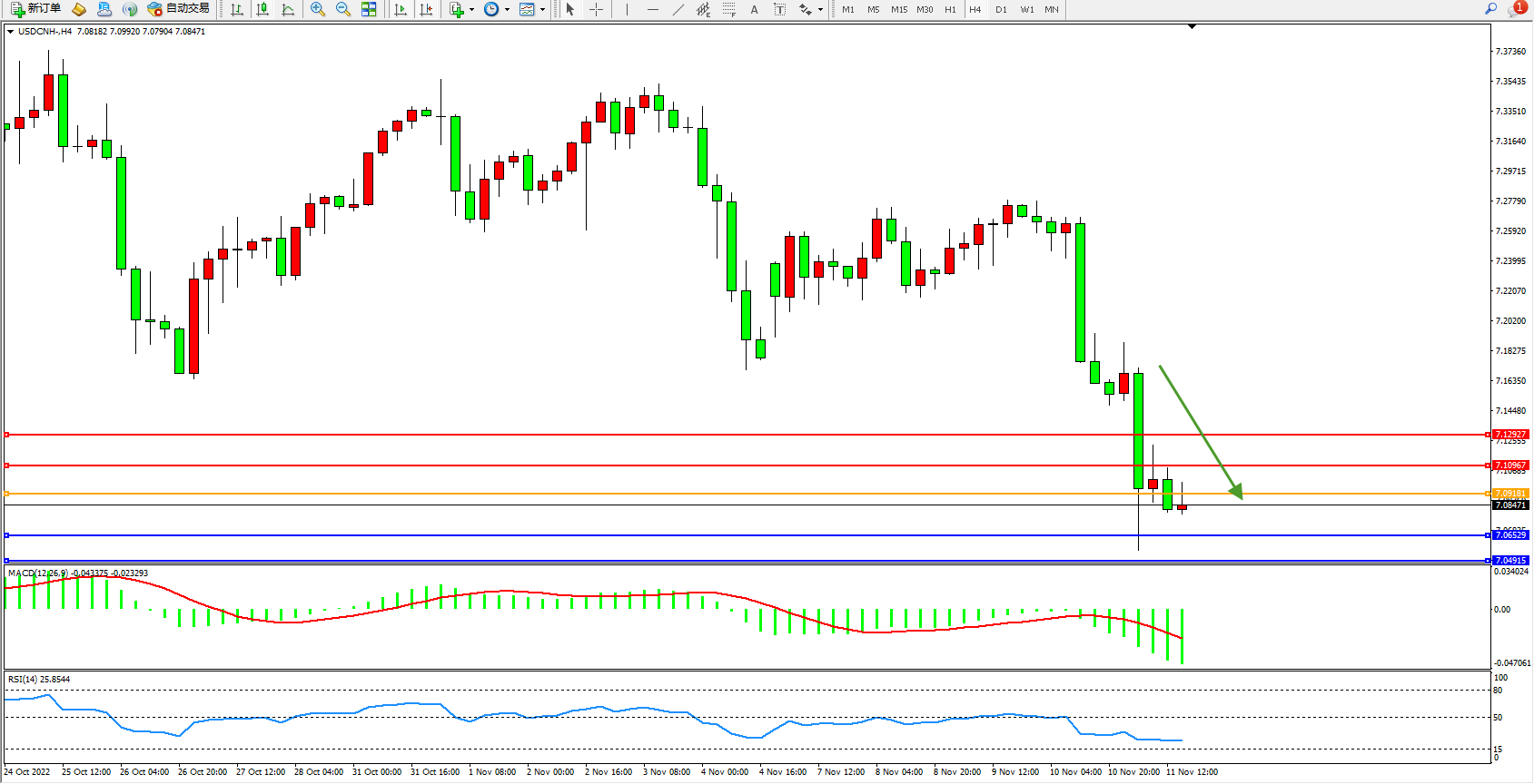 4小时图看:空头震荡持续下行,低位短期下行动力虽有减弱,但下行趋势依旧,MACD指标处于空头区域持续下行,RSI指标处于空头区域低位整理;