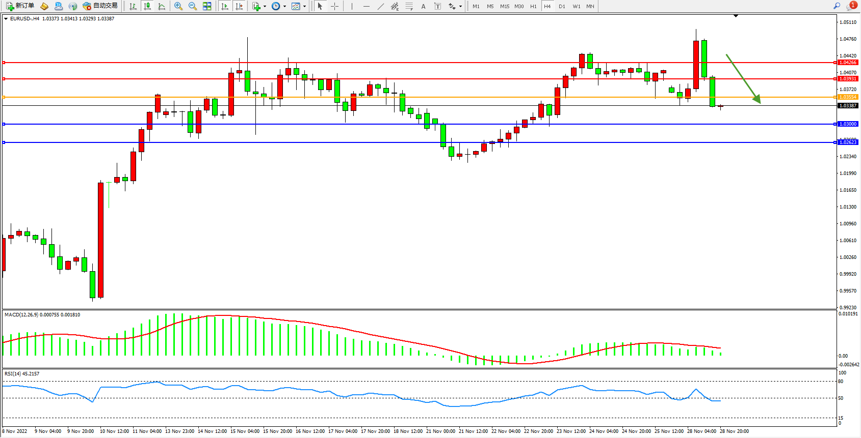 欧元美元EURUSD—4小时K线图显示: