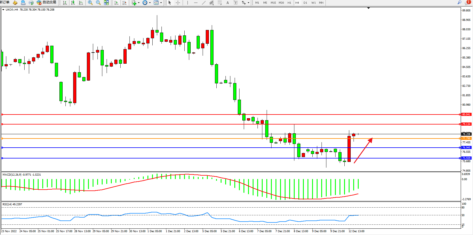 交易策略:77.799上方看涨,目标79.134、80.041