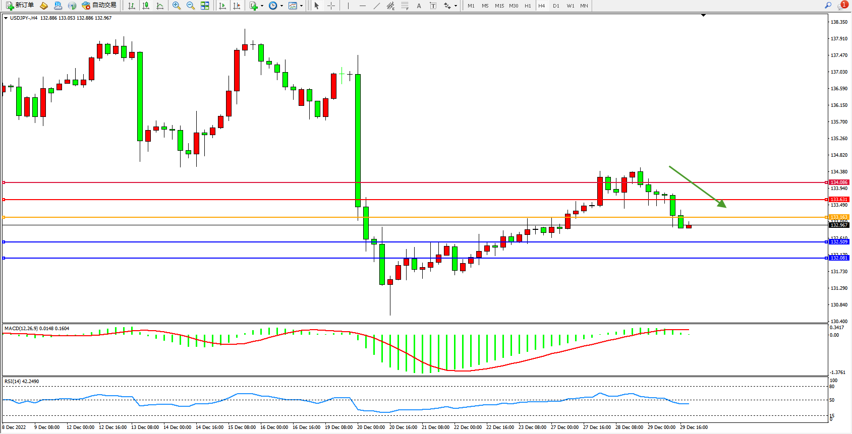 4小时图看:空头动力震荡下行,短期跌势或将持续,市场整体处于偏弱势,MACD指标处于0轴线上側弱势徘徊,RSI指标处于50均衡线下侧弱势整理;