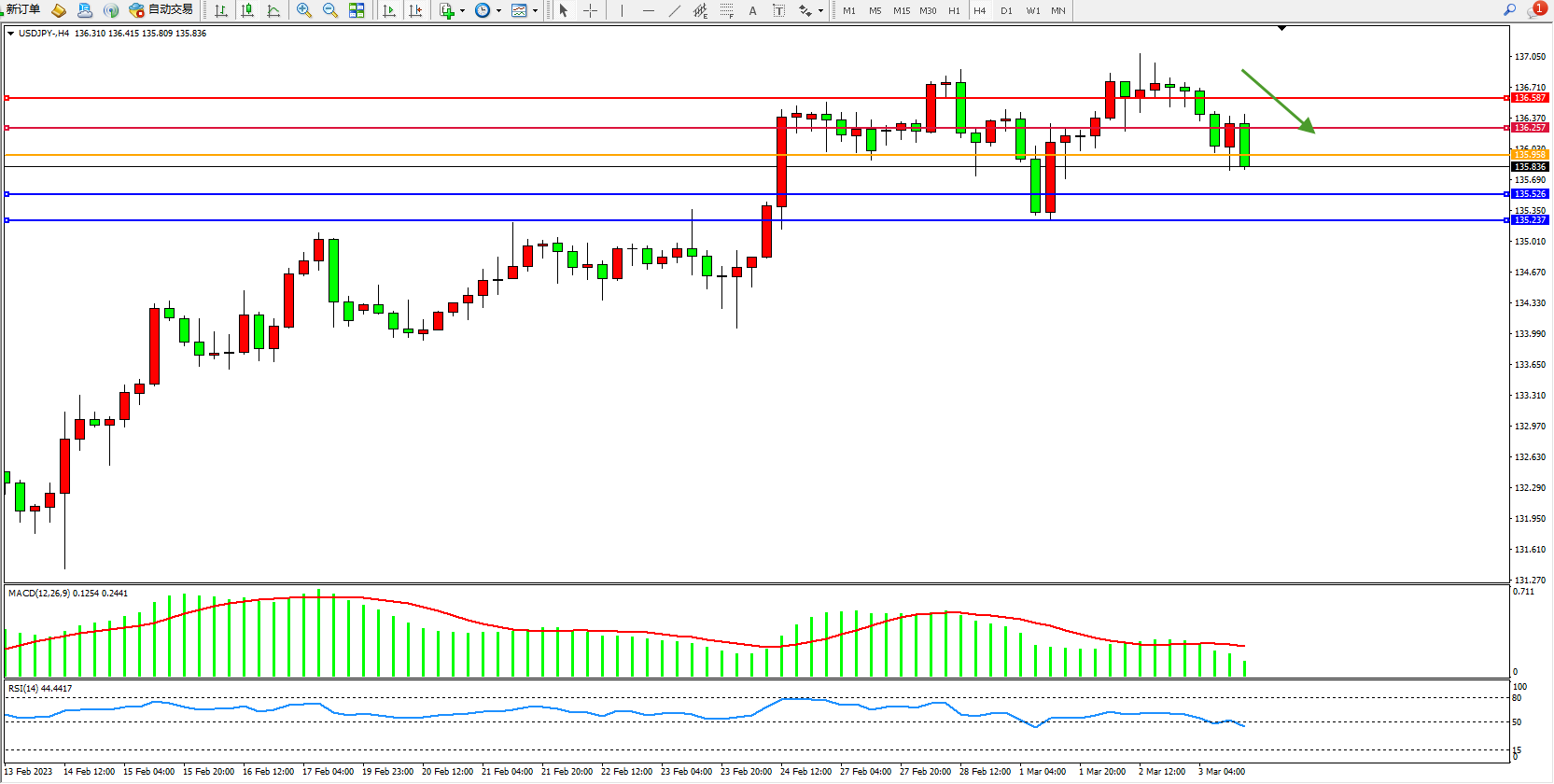 4小时图看:高位空头动力震荡回撤,市场空头动力开始缓慢涌现,短期有继续向下移动态势,MACD指标处于多头区域整理下移,RSI指标处于50均衡线徘徊下移;