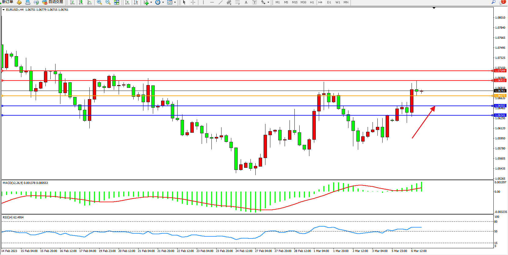 欧元兑美元维持1.06761附近震荡,欧洲央行理事会有影响力的成员已明确将未来利率走势与核心通胀的变化联系起来,预计欧洲央行将把存款利率上调至3.5%以上。