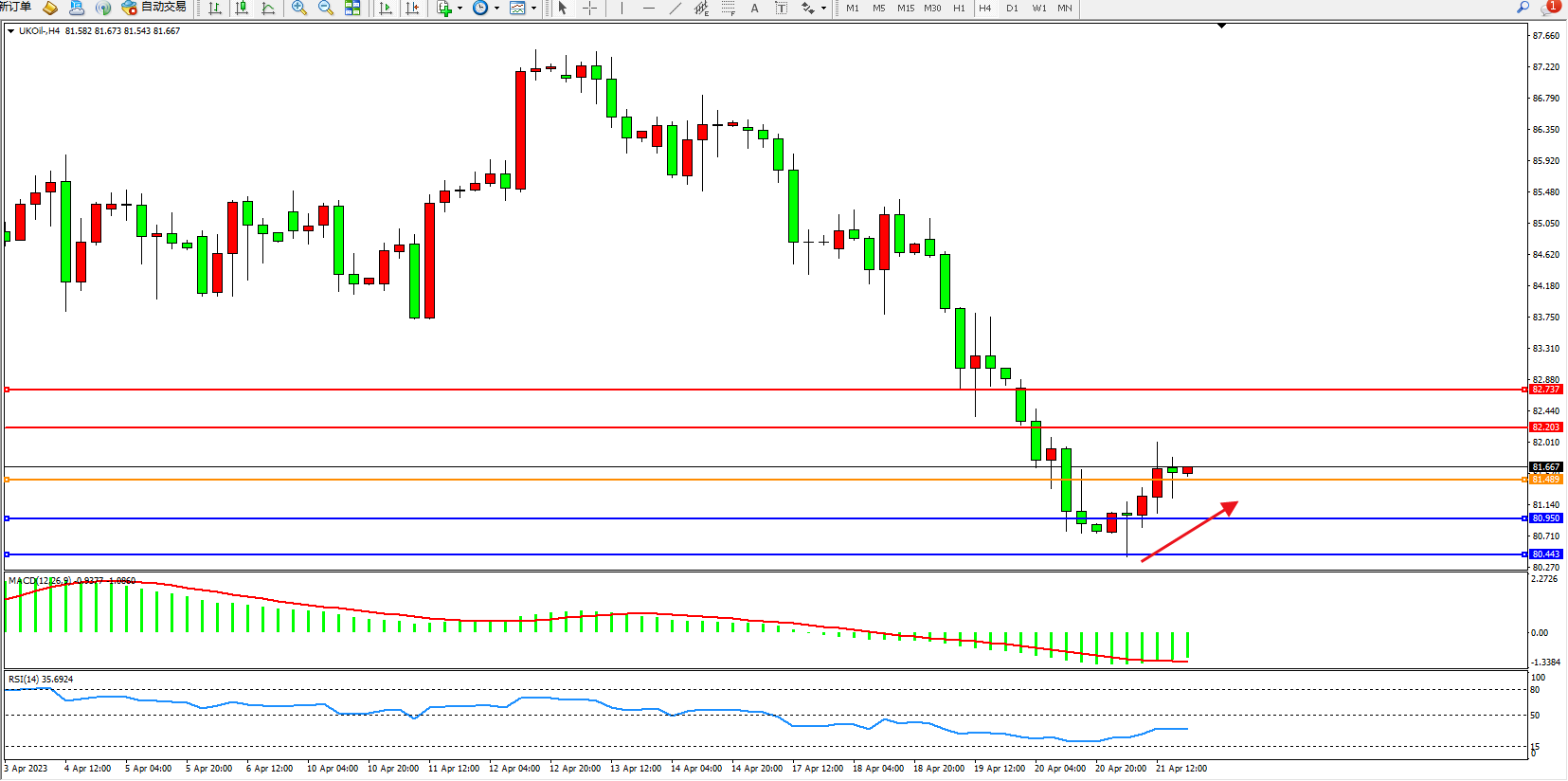 4小时图看:低位多头动力持续震荡拉升,短期看涨情绪涌现,多头不断攀升中,MACD指标处于空头区域维持整理,RSI指标处于空头区域缓慢上行;