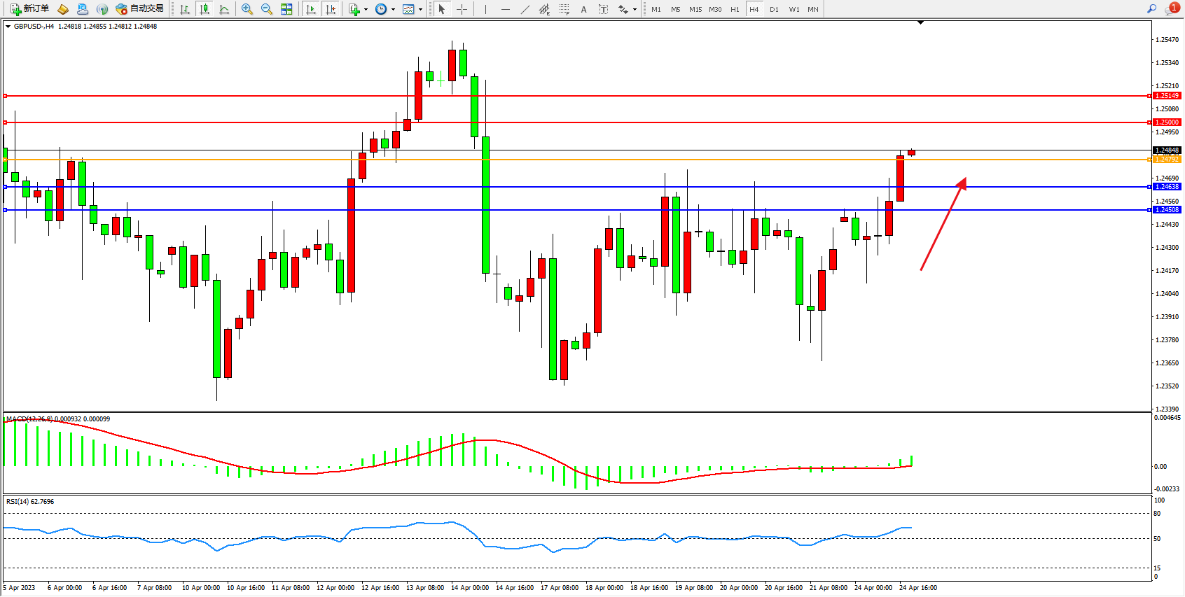 英镑兑美元维持1.24848附近震荡。市场对于英央行5月加息25个基点的预期仍然是高概率的。现在认为到9月时利率将从目前的4.25%上升到4.9%左右。利率水平与美元基本持平的情况下,英镑或短时期内还是能够得到一定程度的支撑。