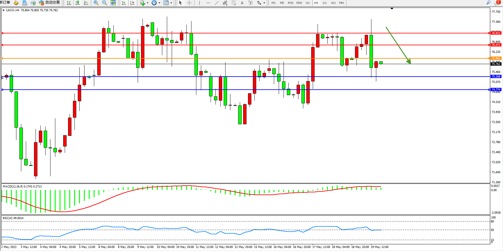 交易策略:75.964下方看跌,目标75.268 74.774