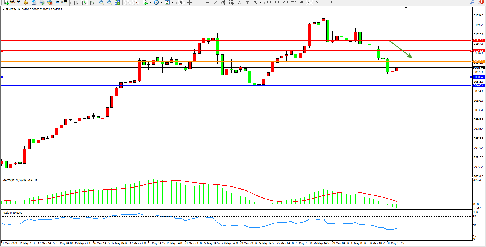 日经225指数5月31日(周三)收盘下跌449.66点,跌幅1.44%,报30878.50点。日本股市可能会在宽松的宏观环境下继续上涨,最早可能在2025年上半年达到1989年时的历史高位。如果能够实现两位数的净资产收益率,日本股市将创下泡沫经济以来的历史新高,而这需要日本的核心CPI达到1.5%或更高。
