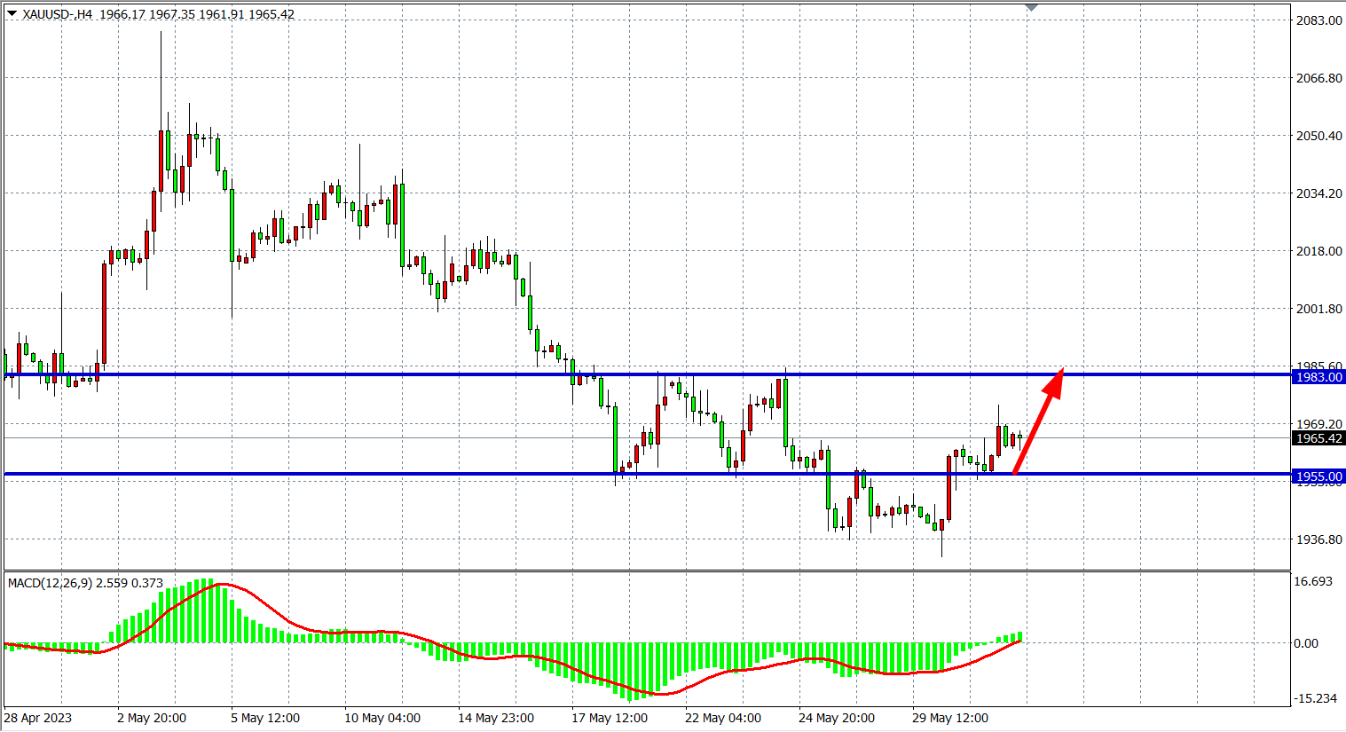 4小时图看,黄金在1955附近企稳后继续反弹,当前支撑继续关注19555附近,MACD量能在零轴之上小幅放量,趋势转为多头,在1955之上看涨,上方目标1980-2000。