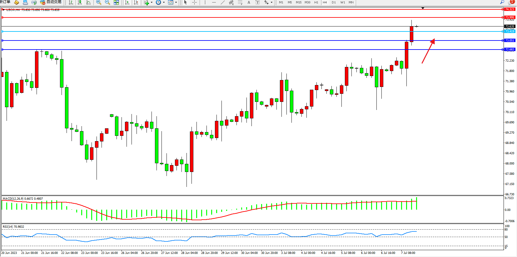 4小时图看:多头动力高位强势拉升上扬,短期看涨情绪依旧,市场多头不断攀升中,MACD指标处于多头区域持续上移,RSI指标处于多头区域高位整理;