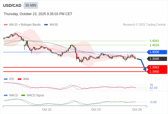 美元/加元 当日内 : 看跌,在 1.4008 之下。