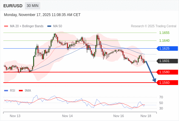 在 1.1625 之下,看跌,目标价位为 1.1580 ,然后为 1.1560 。