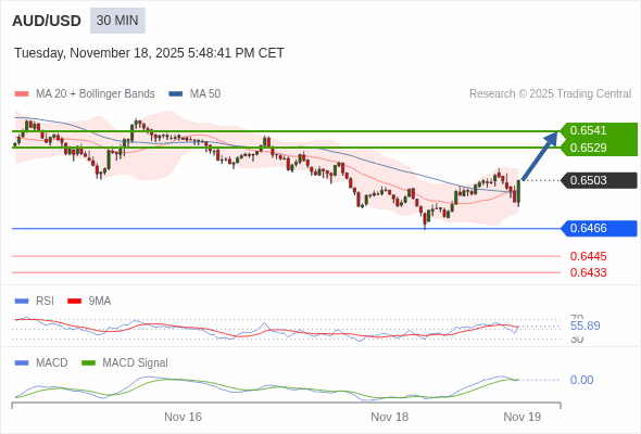 澳元/美元 当日内 : 看涨,当 0.6466 为支撑位,目标定在0.6541。