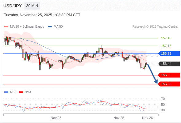 在 156.85 之下,看跌,目标价位为 156.00 ,然后为 155.65 。