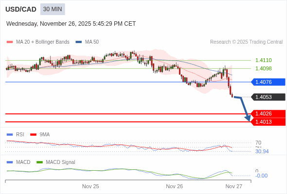 美元/加元 当日内 : 看跌,在 1.4076 之下。