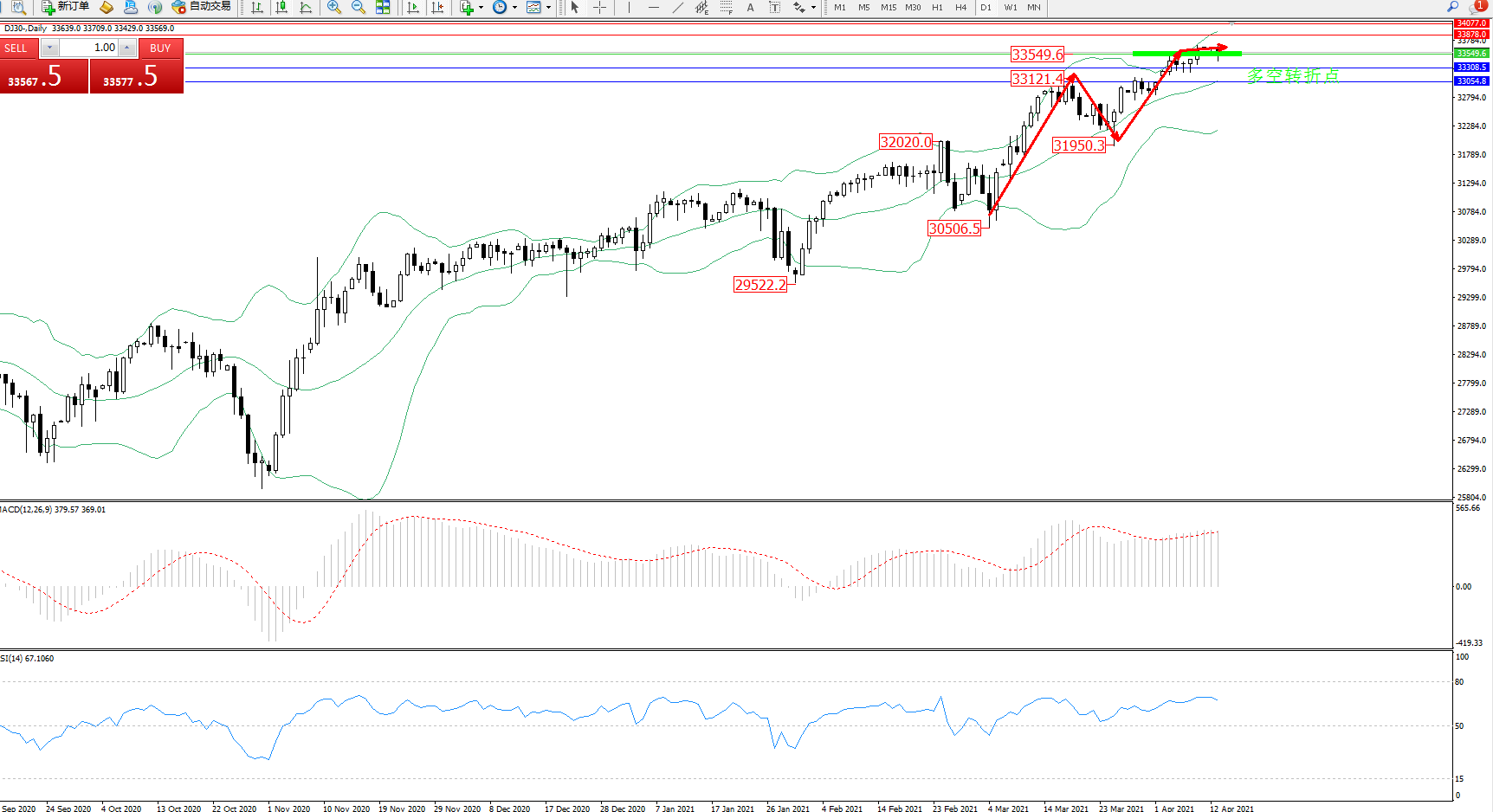 道琼斯指数4月13日(周二)收盘下跌66.35点,跌幅0.20%,报33679.05点;美股收盘,三大股指涨跌互现,道指初步收跌。3月份美国消费者物价指数上涨0.6%,是2012年以来最大升幅,因疫苗接种推进和大规模财政刺激释放了被压抑的需求,开启了多数经济学家预计的短暂通胀上升期。美国财政部发行30年期国债获得良好需求之后,美国国债延续涨势,10年期美债收益率尾盘跌超5个基点,至1.614%,为3月25日以来最低水平。投资者正在关注通胀压力是否会持续下去的迹象,白宫已经表示,通货膨胀很可能在未来几个月暂时加速之后出现回落。