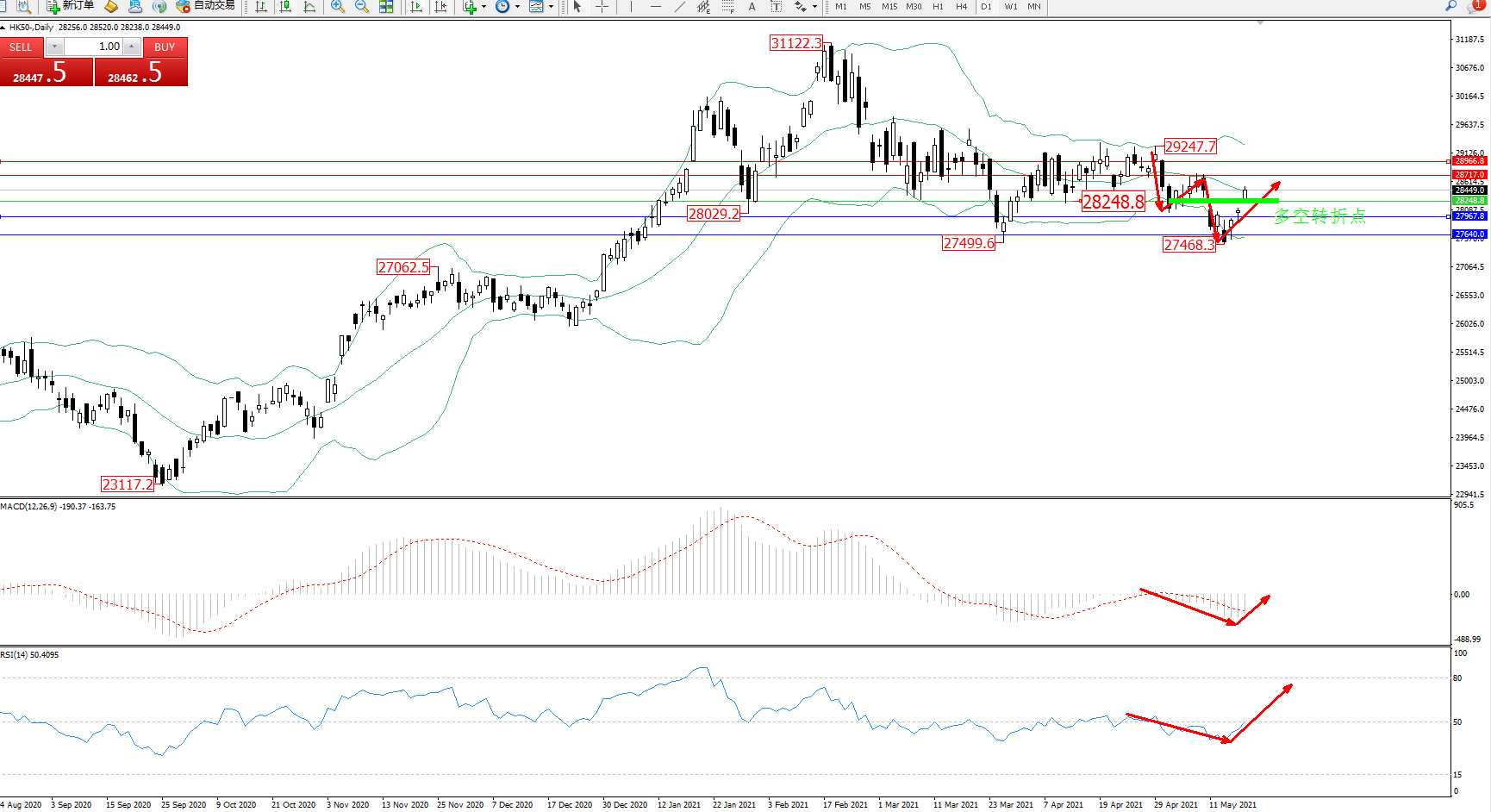 技术点评:空头动力延续布林带指标通道中下轨区间呈阶梯式震荡下行,低位抵达27468位置后得到短暂支撑反转上移,多头动力有伺机入场态势,布林带指标呈张口走势后开始缓慢收口,MACD指标处于0轴线下方空头区域弱势整理徘徊,RSI指标处于50均衡线下方空头区域维持窄幅整理回升中;