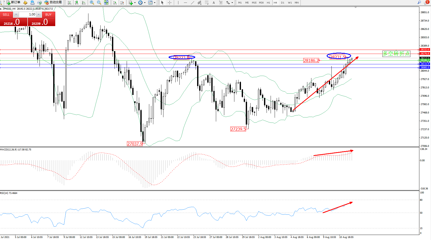 技术点评:多头动力延续布林带指标通道中上轨区间持续震荡上扬,处于上轨附近多头动力持续攀升中,前期高位28223位置短暂破位,布林带指标呈张口走势持续中,MACD指标处于多头区域不断震荡向上移动中。RSI指标处于多头区域持续震荡上扬;