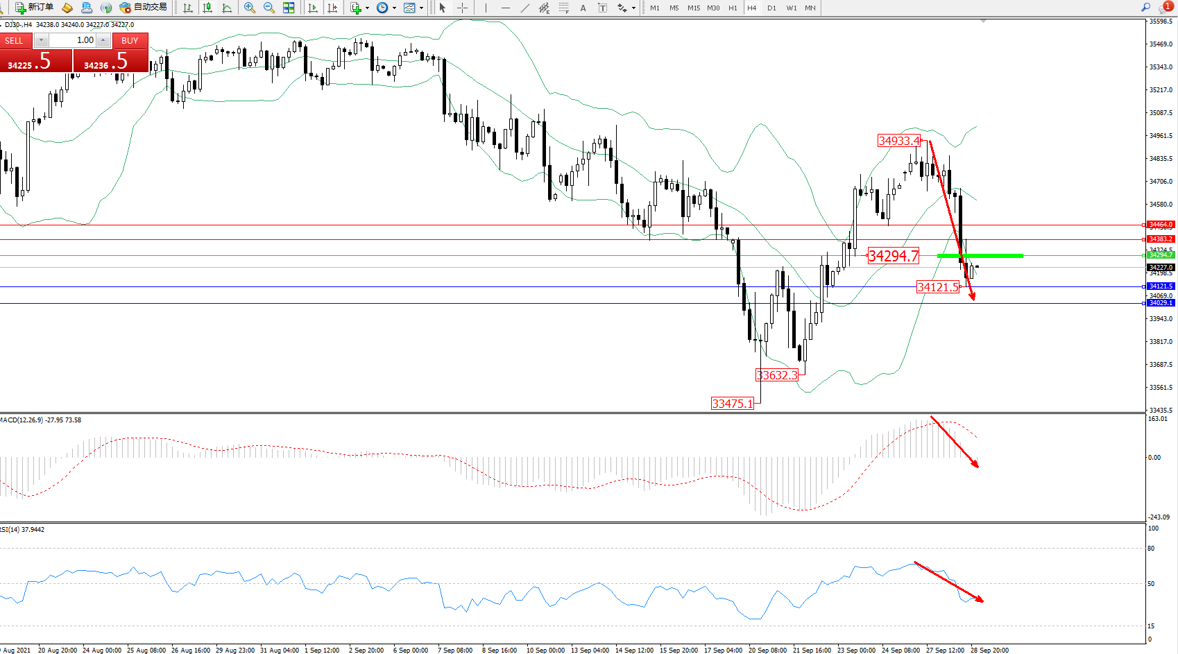 技术点评:高位空头动力急速震荡下行,低位抵达34121位置节点后开始整理,空头动力有进一步向下移动态势,布林带指标呈张口走势持续中,MACD指标处于多头区域持续震荡下行至0轴线下侧整理,RSI指标跌破50均衡线进入空头区域维持震荡中;