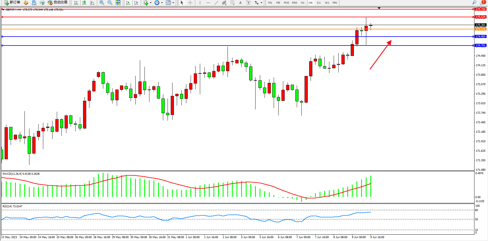 4小时图看:高位多头动力持续震荡上扬,短期看涨情绪依旧,市场多头趋势不断拉升,MACD指标处于多头区域强势上移,RSI指标处于多头区域高位整理;